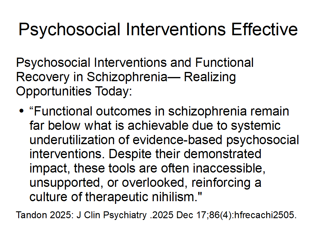 Tandon et al. 2025: Psychosocial Interventions and Functional Recovery in Schizophrenia—Realizing Opportunities Today. “Functional outcomes in schizophrenia remain far below what is achievable due to systemic underutilization of evidence-based psychosocial interventions. Despite their demonstrated impact, these tools are often inaccessible, unsupported, or overlooked, reinforcing a culture of therapeutic nihilism."