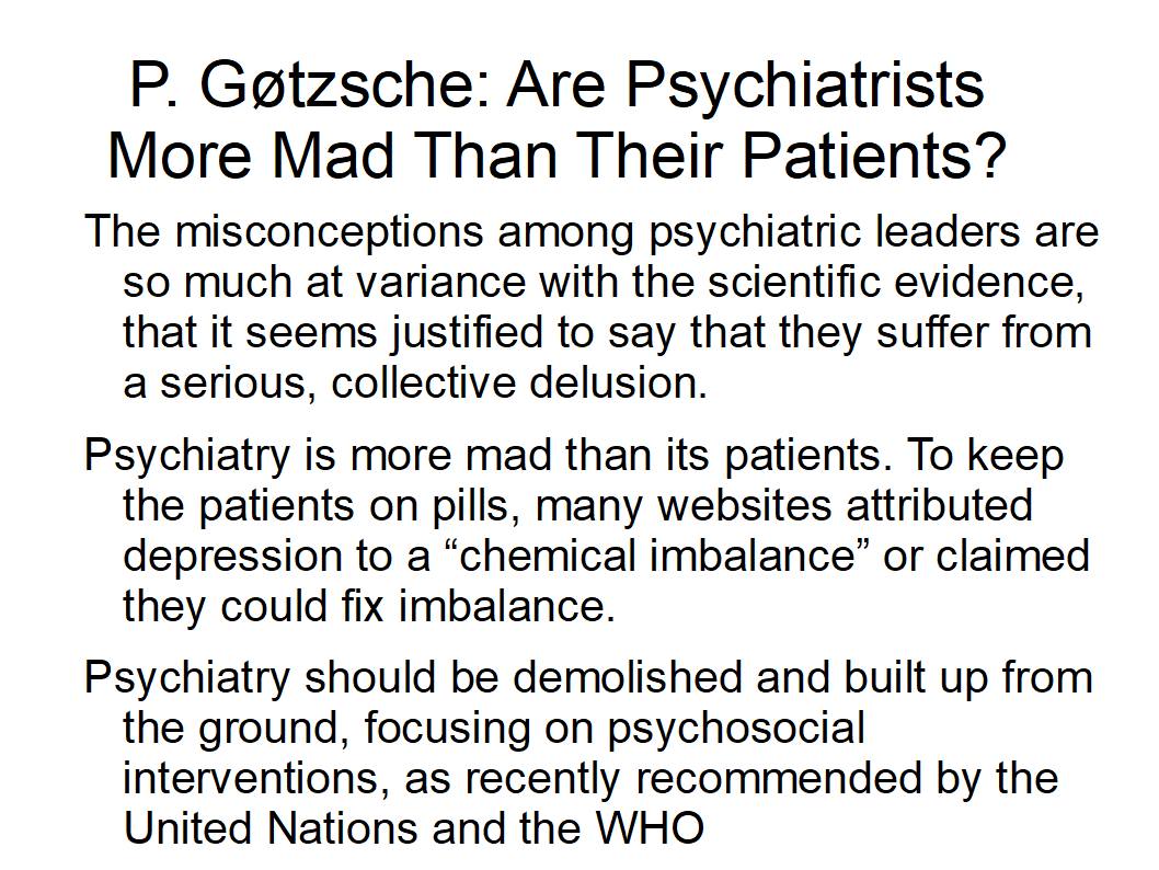 Peter Gøtzsche har beskrevet forholdene som mafiøs. Psykiatere blir beskrevet i psykiatriske termer som virkeligahetsfornektere og at kriteriene som for sinnslidelse oppfylles.