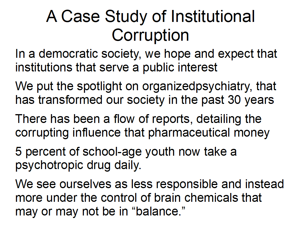 Vitenskapsjournaisten Robert Whitaker har i 20 år solid dokumentert om at psykiatere har vrangforestillinger nå man legger vitenskapelige studier til grunn og er skadelig for samfunnet. Han har også sammen med sin partner skrevet om institusjonell korrupsjon.