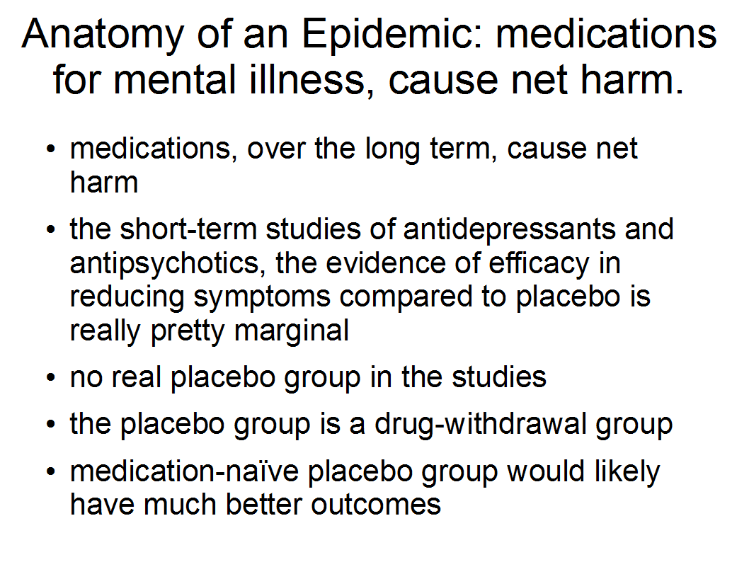 Medisineringen av for mange i for lang tid har ingen støtte i forskning. Nye retningslinjer gjør tvangsmedisinering overflødig og ulovlig. Falsifisering av av psykiatriens myter tvinger frem et paradigmeskifte og en revolusjon i behandling for å oppnå recovery. En forsker spør: Blir medisinhistoriens største skandale fortiet i mediene?